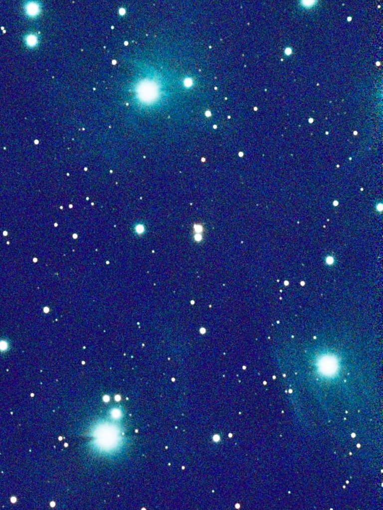 This is what we know of the Pleiades: It’s 439 light years away, so the photos taken last night and which you are seeing here was the Pleiades as it existed in on a December night in 1584. The visible magnitude of the open cluster is 1.6, very bright (to us) as clusters go. Most people can see six stars under moderately dark skies. Those living far away from artificial light count seven, hence the Seven Sisters nickname. Kepler, who gave us the three laws of motion, catalogued 14 without optical aid.