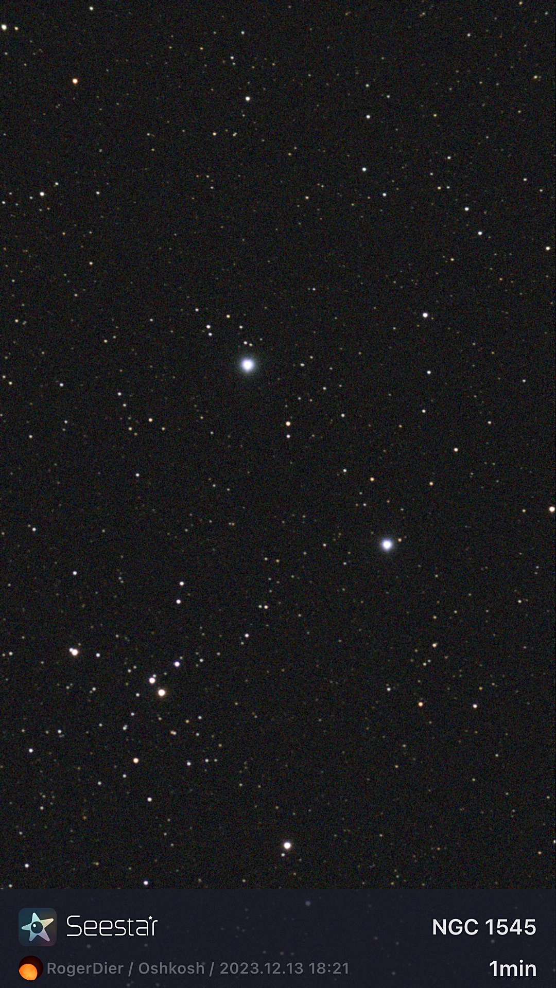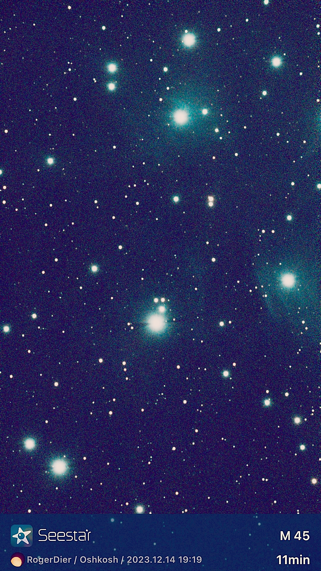 THE SKY BEHAVED on Thursday, Dec. 14, 2023. We had a seasonably warm (47 degrees) sunny day here on the west coast of Lake Winnebago, and when the sun quit the sky at 4:16 p.m., the temps were still in the mid-30s. I am fond of this time of year because the canopy of stars appear so early in the evening. By 5:30 p.m., the SeeStar was set up on our north driveway.