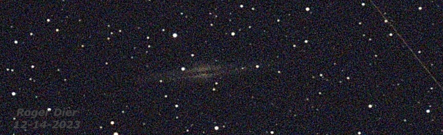This galaxy is not easy to see, but there it is, a flying saucer-shaped object in the middle of this cropped, two-minute exposure and to the left of the satellite the camera captured during exposure.
