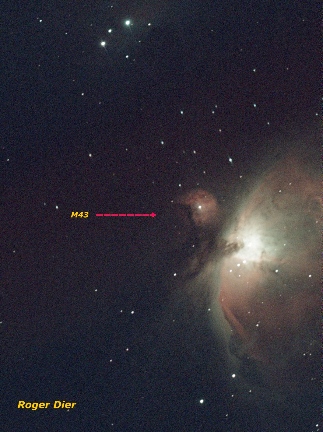 The Orion Molecular Cloud Complex is in the northern Milky Way. It contains about 3,000 stars and spreads out over hundreds of light years. When interstellar gas and dust come together in a gravity party, stars are often born. I’ve highlighted the location of M43, the little brother of M42, which dominates the scene. A river of dust separates the objects. Some observers liken M42 to a crab, or a lagoon. Whatever the nickname, this reflection nebula is spectacular, the brightest (4th magnitude) nebula in the night sky.