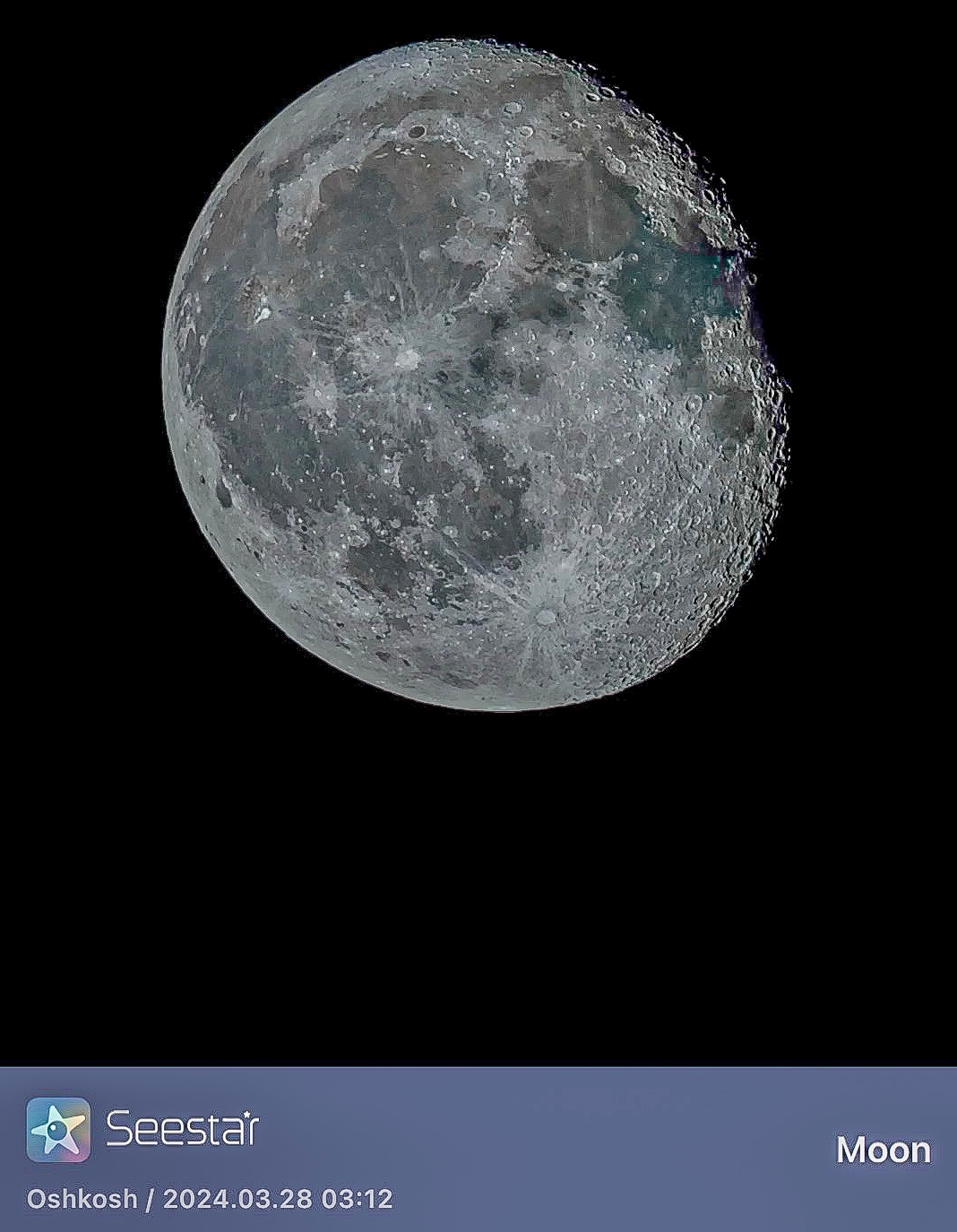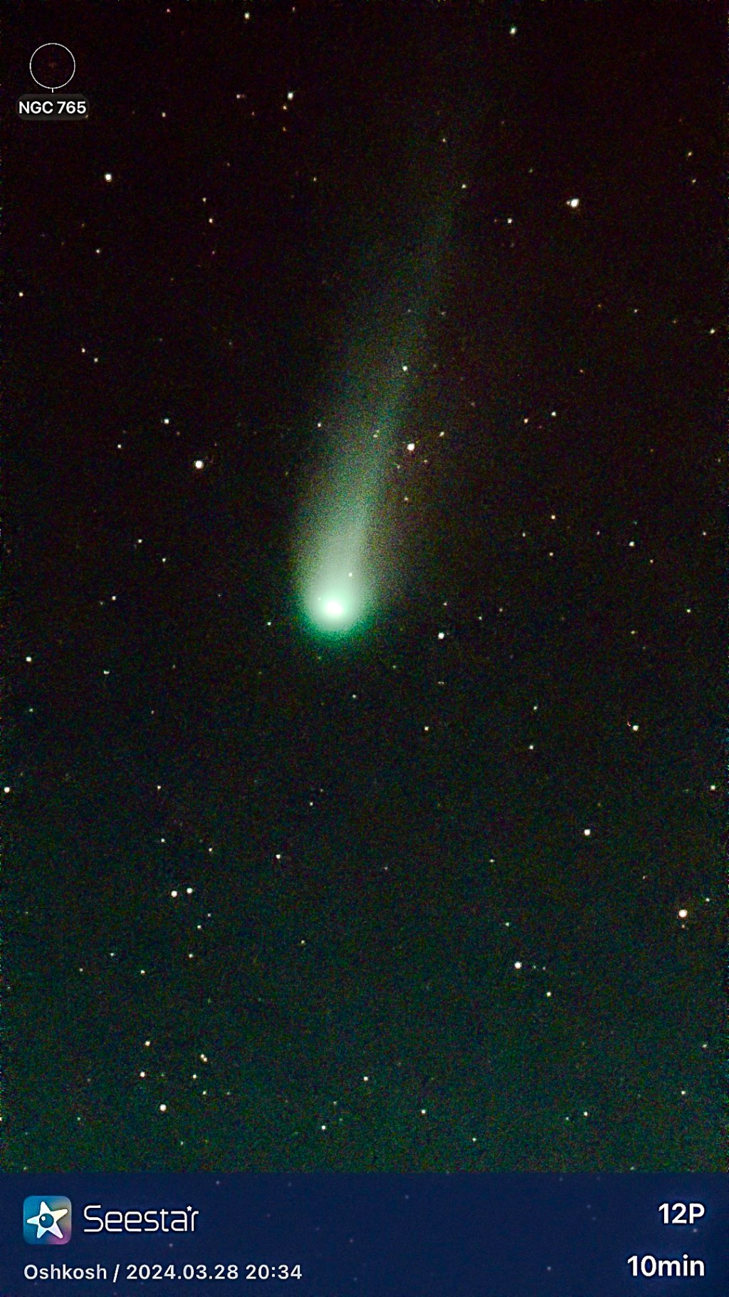 Coincidentally, Comet Pons-Brooks will make its closest approach to the sun during eclipse week. A few nights ago, I traveled a few miles out of town to shoot it with my SeeStar S50. The comet was much lower in the sky at sunset than early in March when I first shot it. Under a darker sky, the tail is about 30 degrees long. Electromagnetic energy from the sun creates the tail through sublimation; changing the comet’s surface from solid to gas.