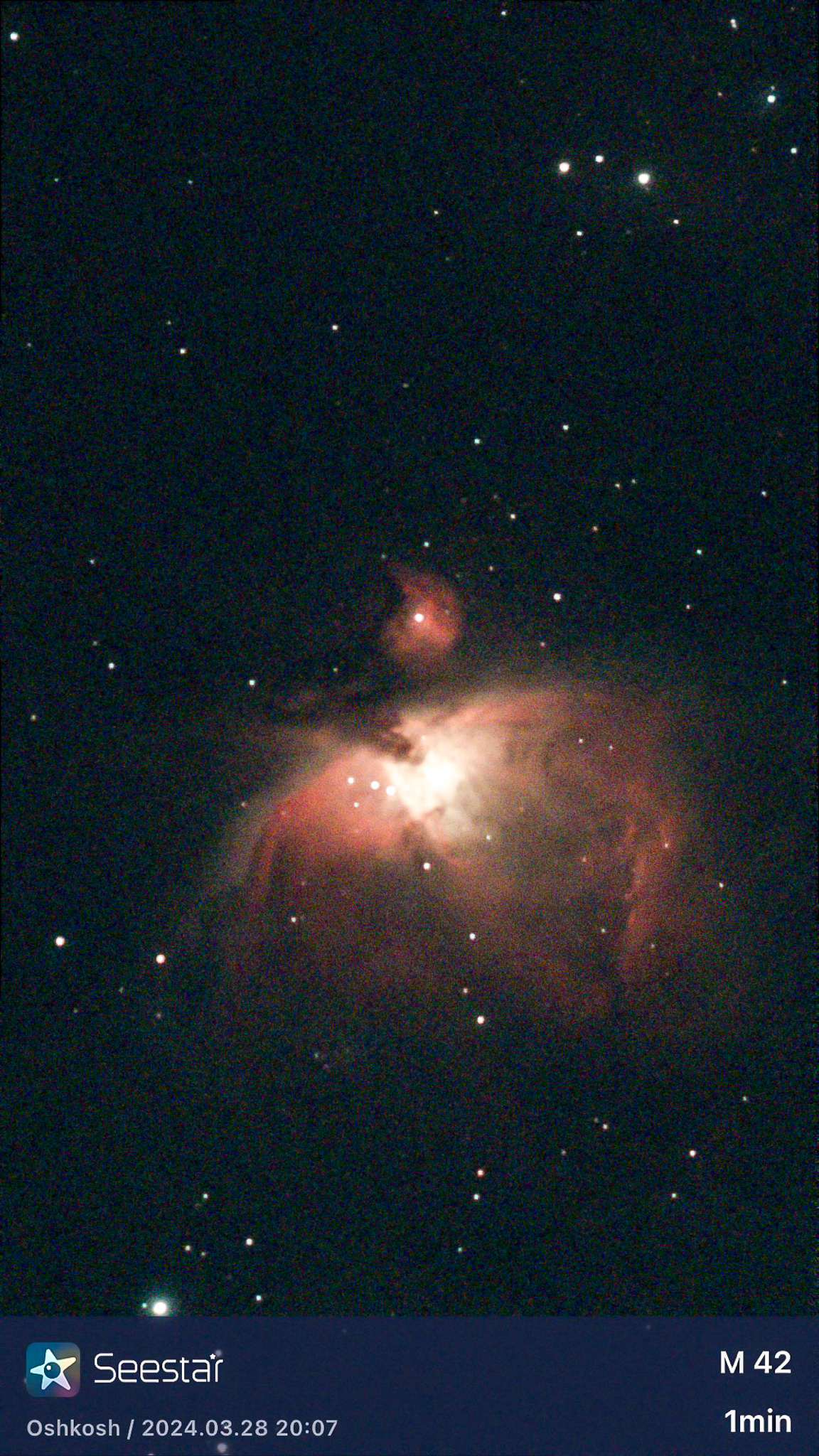 While waiting for the sky to deepen, I shot a one-minute exposure of the great Orion Nebula, M42. Hydrogen gives off a red color in the visible parts of the spectrum, and hydrogen is everywhere in M42, and throughout the cosmos. Hydrogen is the main compound (62%) in our bodies. There are other life forms beyond Earth. If those life forms make themselves known to us, hydrogen will be the primary building block in their bodies, too.