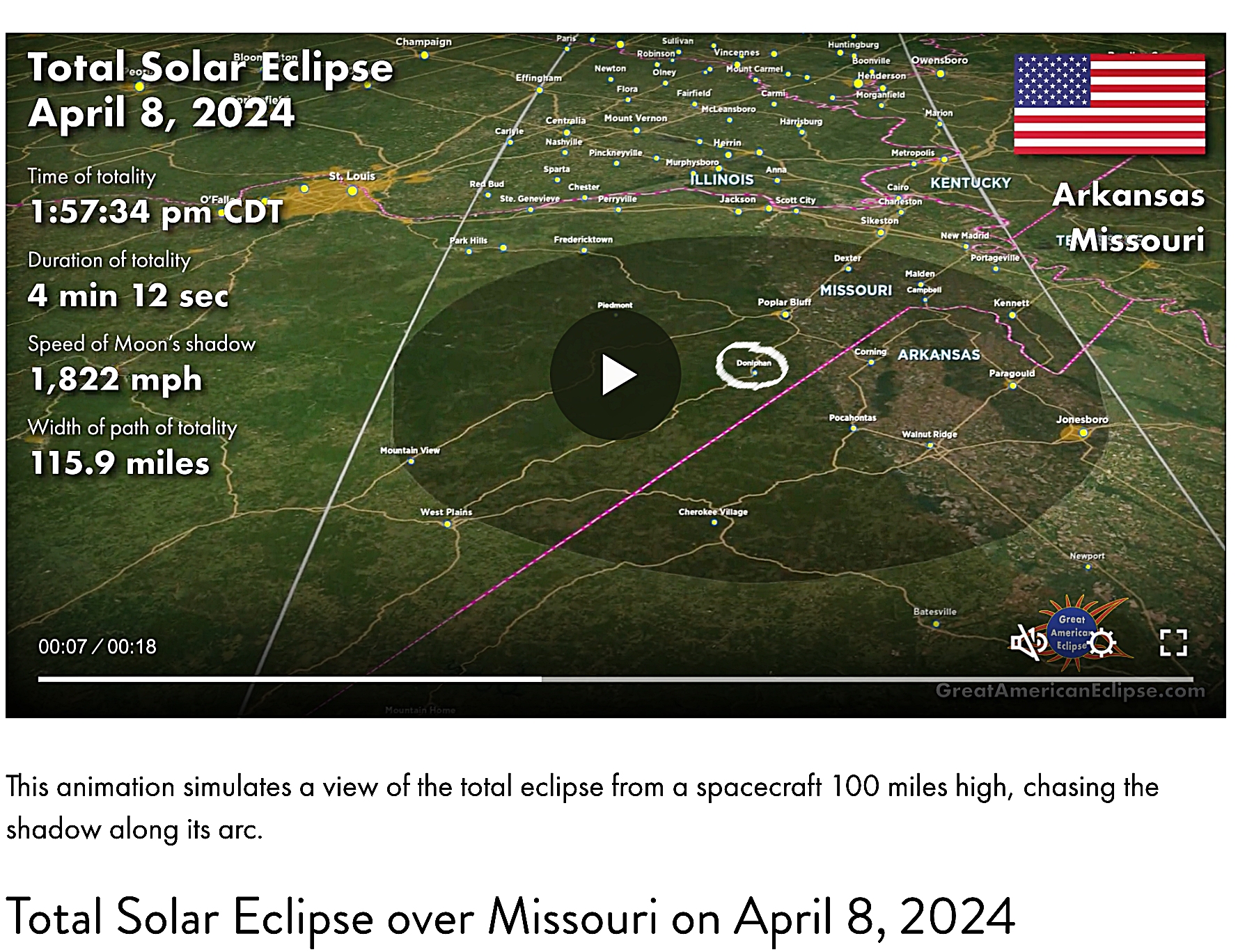I took a screen shot on the GreatAmericanEclipse.com website to illustrate where we were on April 8. Doniphan, Missouri (circled) was pretty much on the centerline. The pink dotted line is the border between Missouri and Arkansas.