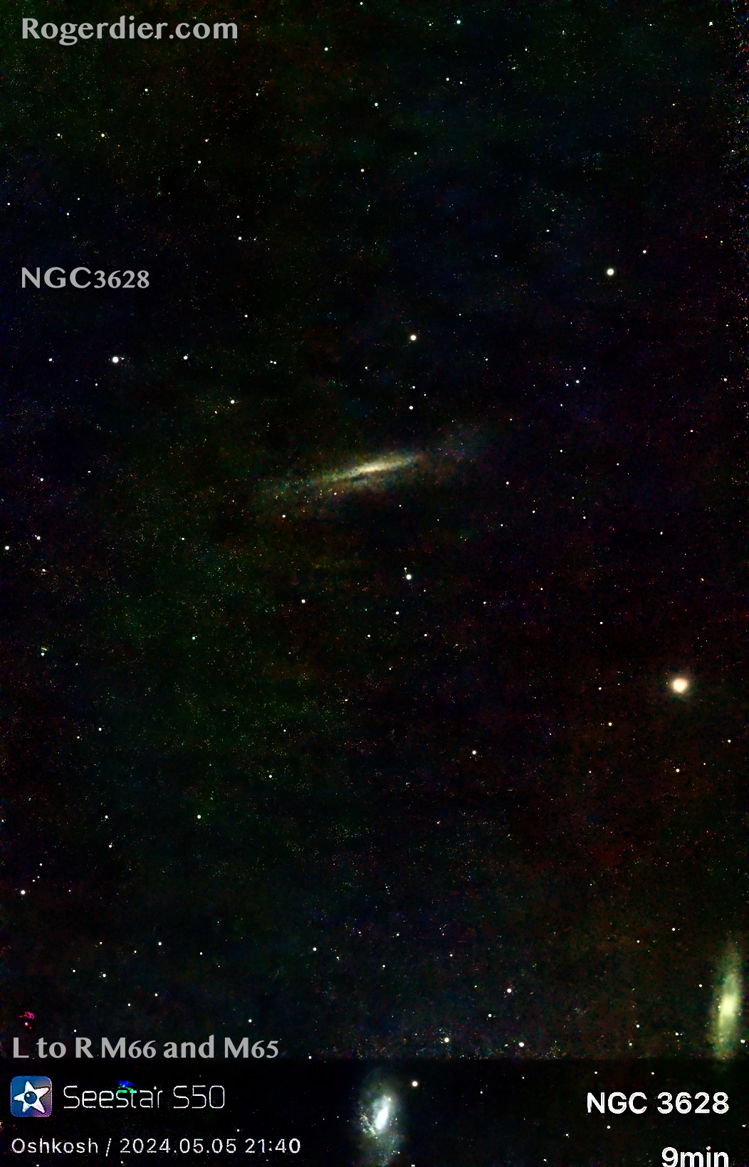 The dimensions of the SeeStar’s field of view is about three-quarters of a degree wide and a degree-and-a-quarter long. I’ll do a better job of centering Leo’s Trio in the future, but all three galaxies–NGC 3628 and M65 and M66– are before you.