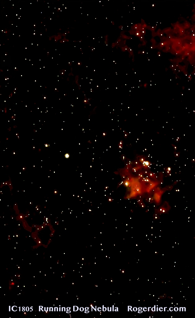 A half hour later after stepping out under the early-morning stars, I had a steaming cup of coffee on the ground next to me, the SeeStar was aligned and leveled and turned toward NGC 896, also astronomically catalogued as IC1805 and Sh2-190 and colloquially known as the Heart nebula or the Running Dog nebula; the latter nickname is now a personal preference. The Running Dog nebula may have flashed through my field of view in years past when my younger self swept over Perseus with two Edmund Scientific Company reflectors—the three-inch purchased in 1967 and the eight-inch purchased in 1985—or the little Celestron C90 bought a 15 years ago and sold three years later, or the 11×80 spotting scope I gave to me daughter, or the Vixen eight-inch modified Maksutove-Cassegrain that I’ve had for a couple of years.