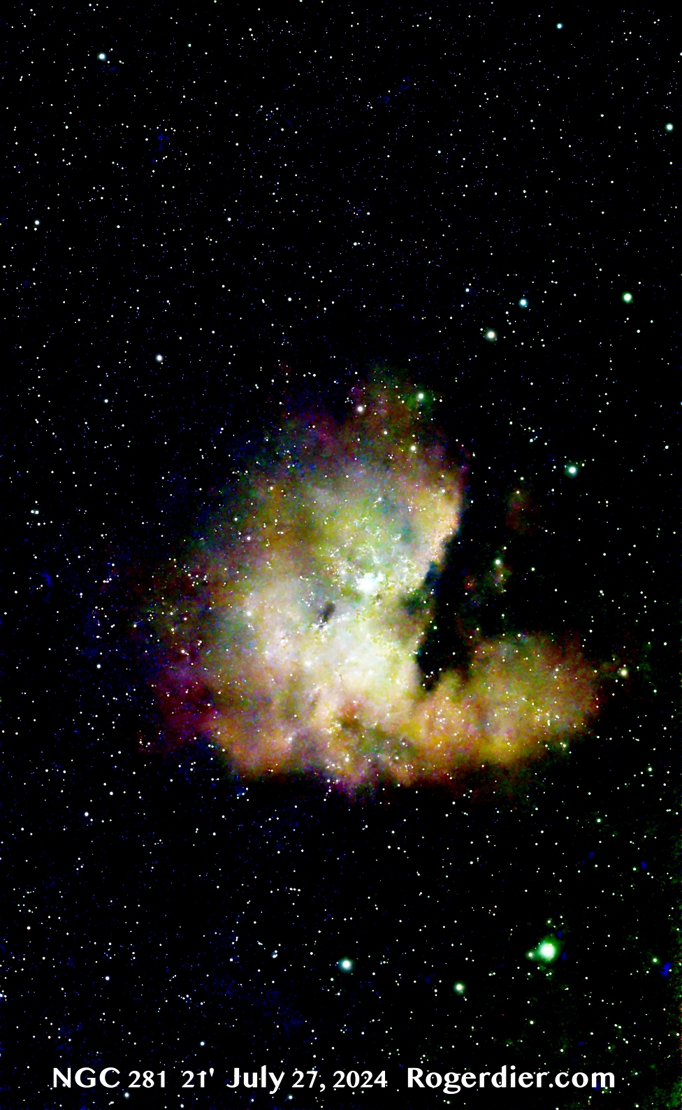 Walter Scott Houston, a hero to many amateur astronomers of the American Baby Boomer generation, wrote of NGC281 in his book Deep Sky Wonders: “There was a faint glow in the immediate vicinity of the multiple star, with an occasional impression of a much larger star.” Houston, who also wrote for Sky & Telescope magazine back in the printed-issues era, said the surface brightness of the nebula was akin to M33 and NGC205, the latter a companion of the Andromeda galaxy. Houston, who left us in 1993 after 81 years on the planet, was born in Tippecanoe, Wisconsin, right next door to the town of Tylertoo.