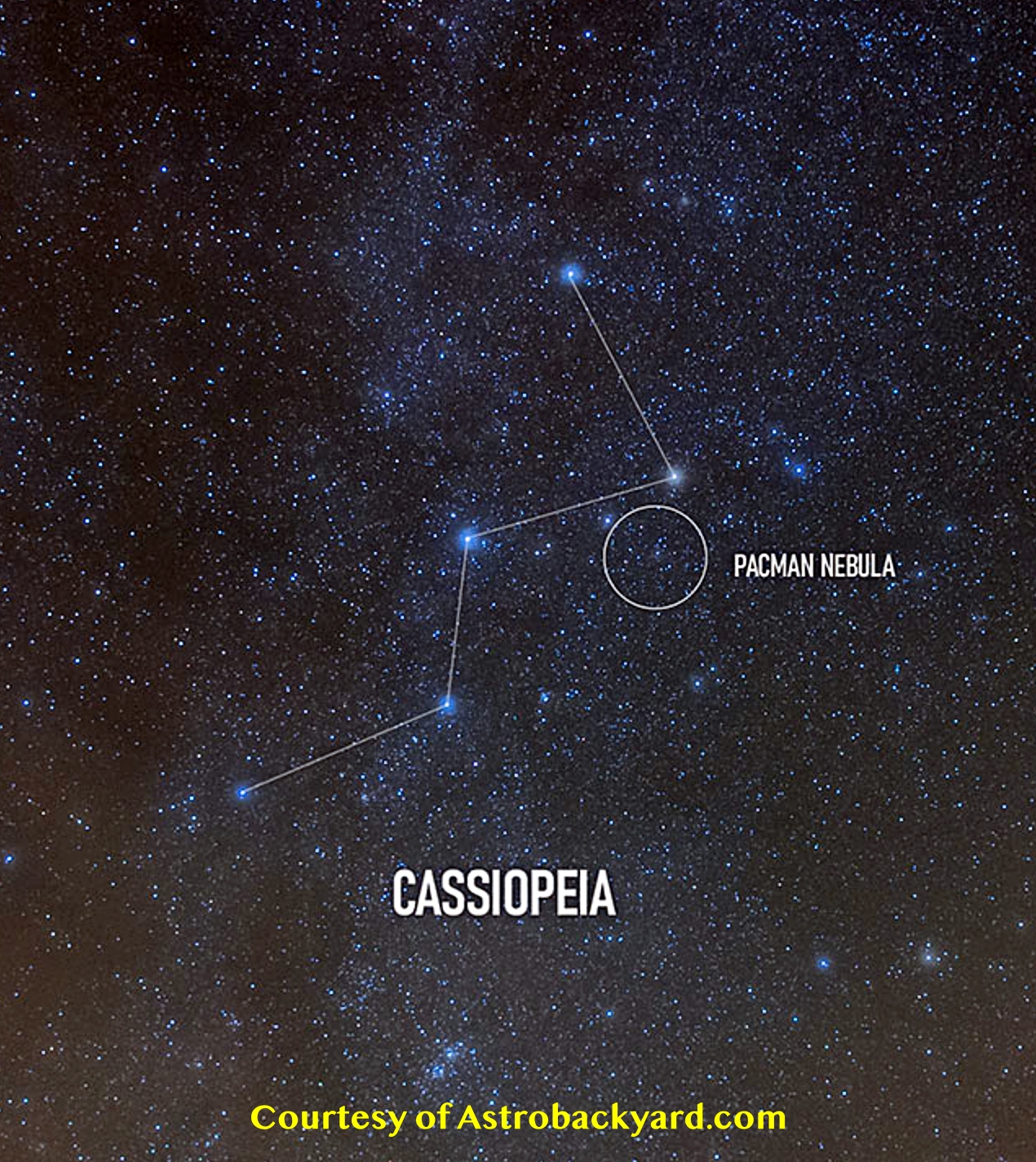 The Pacman is in the Perseus arm of our galaxy and is 9,500 light years from us and 25 million light years wide. Fewer than a million years old, the magnitude 7.4 light we see tonight left the Pacman shortly after the Ice Age ended. With an apparent diameter of 35 by 30 arc minutes—or 41.5 light years wide, a real fatty—an observer needs a dark sky, a small scope or good binoculars to spot it.