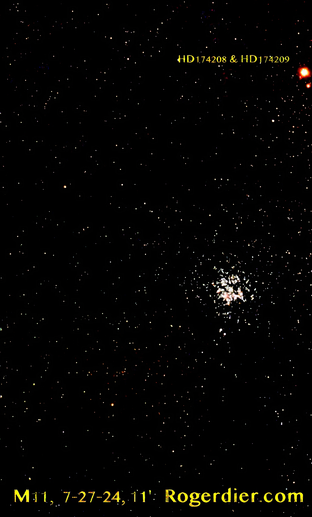 The brightest and most populous stars in the group are blue giants, full of heavy metals. But there are some big red and yellow furnaces in there, too. The cluster formed between 220 and 250 million years ago. From our point-of-view, M11’s stars are a long way off in one of the spiral arms of our galaxy, some 6,120 light years away. And, from where you are looking at it, M11 is big—14 arc minutes in diameter—almost a third of the diameter of the full moon. Though not figuring in the design of the constellation Scutum the Shield, the cluster is situated within its boundaries.
