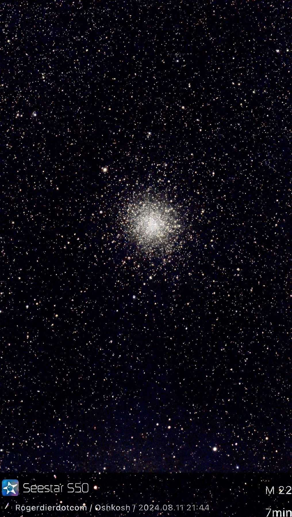 This photo was taken when M22 was 21.56 degrees above the southern horizon. When it transits the meridian, M22 only gets as high as 22.09 degrees above the southern horizon from 43.96 degrees north latitude. This is the best photo of a globular cluster I’ve ever taken.
