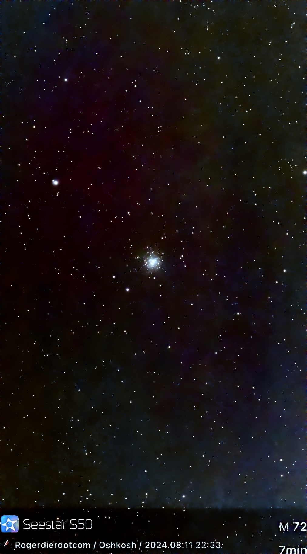 Like M22, fellow globular M72 is a seven-minute exposure taken with a SeeStar S50. It is an ancient globular, even by globular standards, having been around for 9.5 billion years. The old star hub is 54,570 light years from us, located in the constellation Aquarius, and it contains 43 known variable stars. Size-wise from Earth, its 6.6 arc-minute diameter is about 25% of M22’s impressive angular girth. Discovered by Messier colleague Pierre Méchain on the evening of Aug. 29-30, 1780, Messier gave his colleague credit for discovery when he later added it to his famous catalog.
