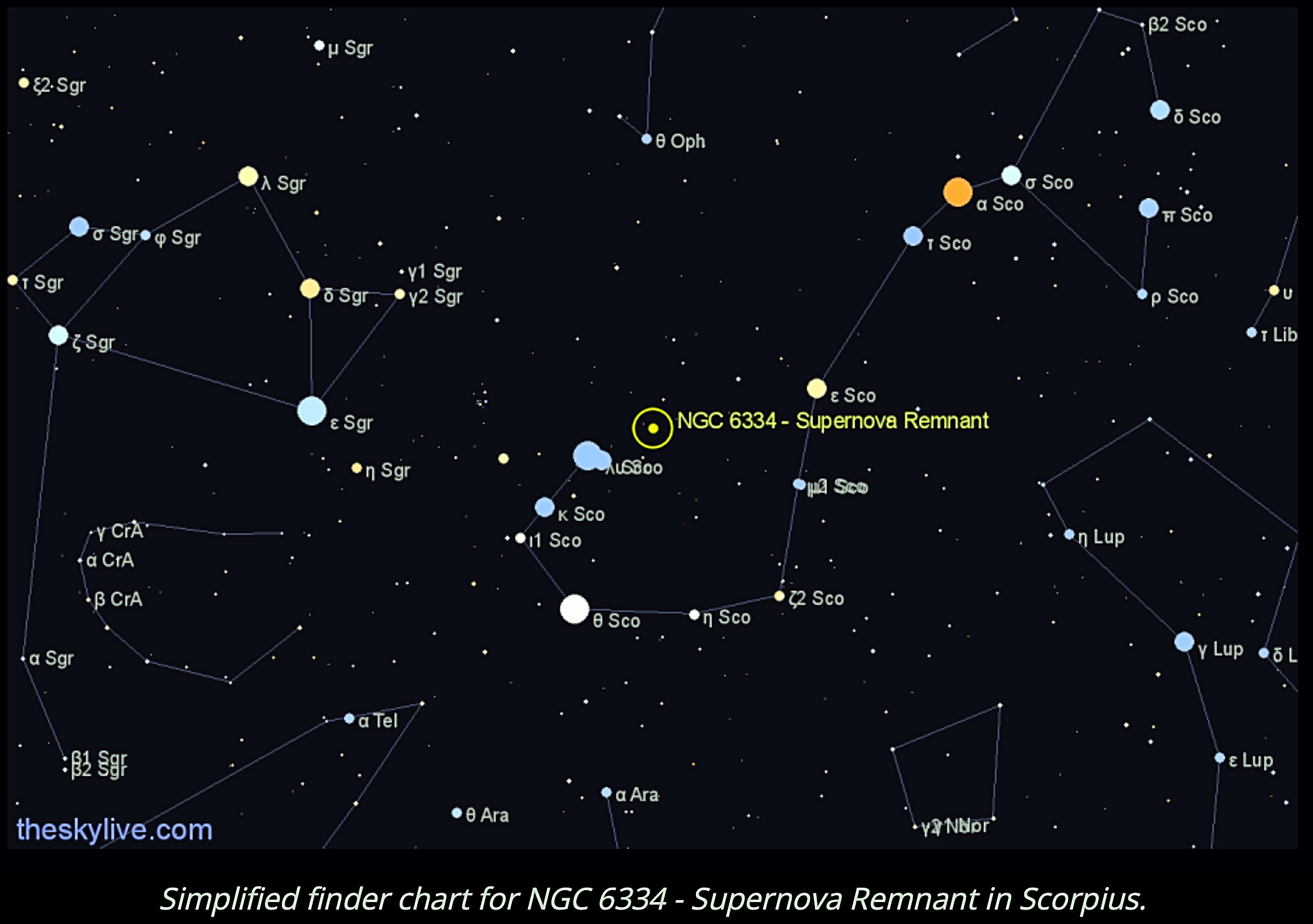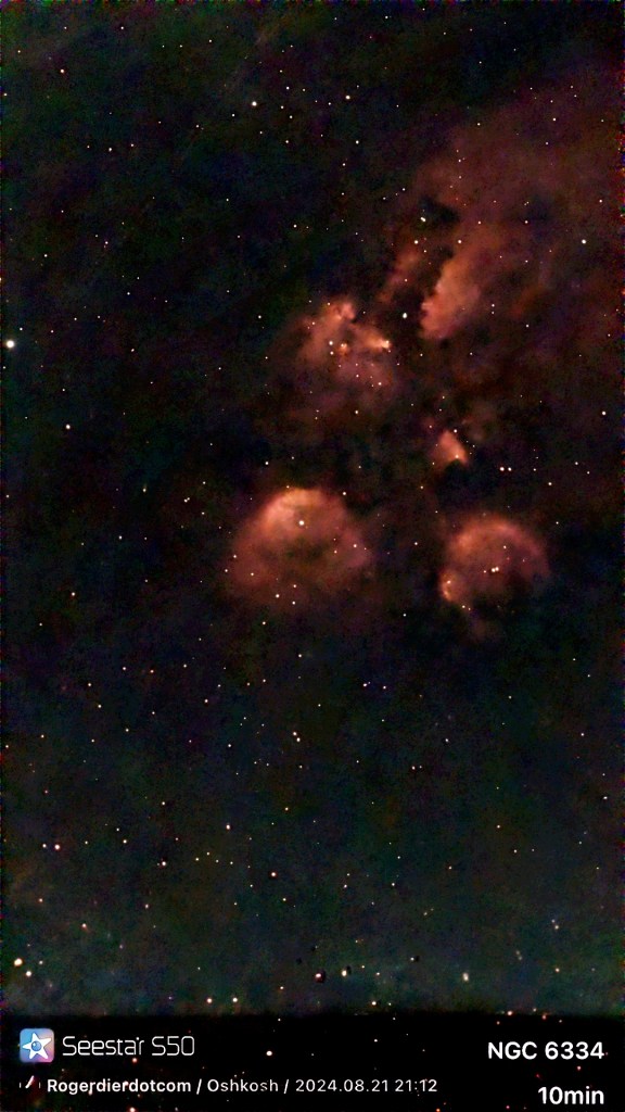 Why does that matter? Outside our home Wednesday evening when the moon was two days past full, I shot two summer star clusters that were quickly sinking in the southwest sky. Those tasks completed, I noticed on SkySafari Plus an object that was new to me with an intriguing nickname. Check that, nicknames: The Cat’s Paw or the Bear Claw. Better known as NGC 6334, the clouds of emission nebula only climb 9.9 degrees above my southern horizon; the quick trip across my meridian lasts a whopping 14 minutes. It was shortly past 9 p.m. local time. If I hurried, SeeStar might be able to peer through the Cat’s Paw window.
