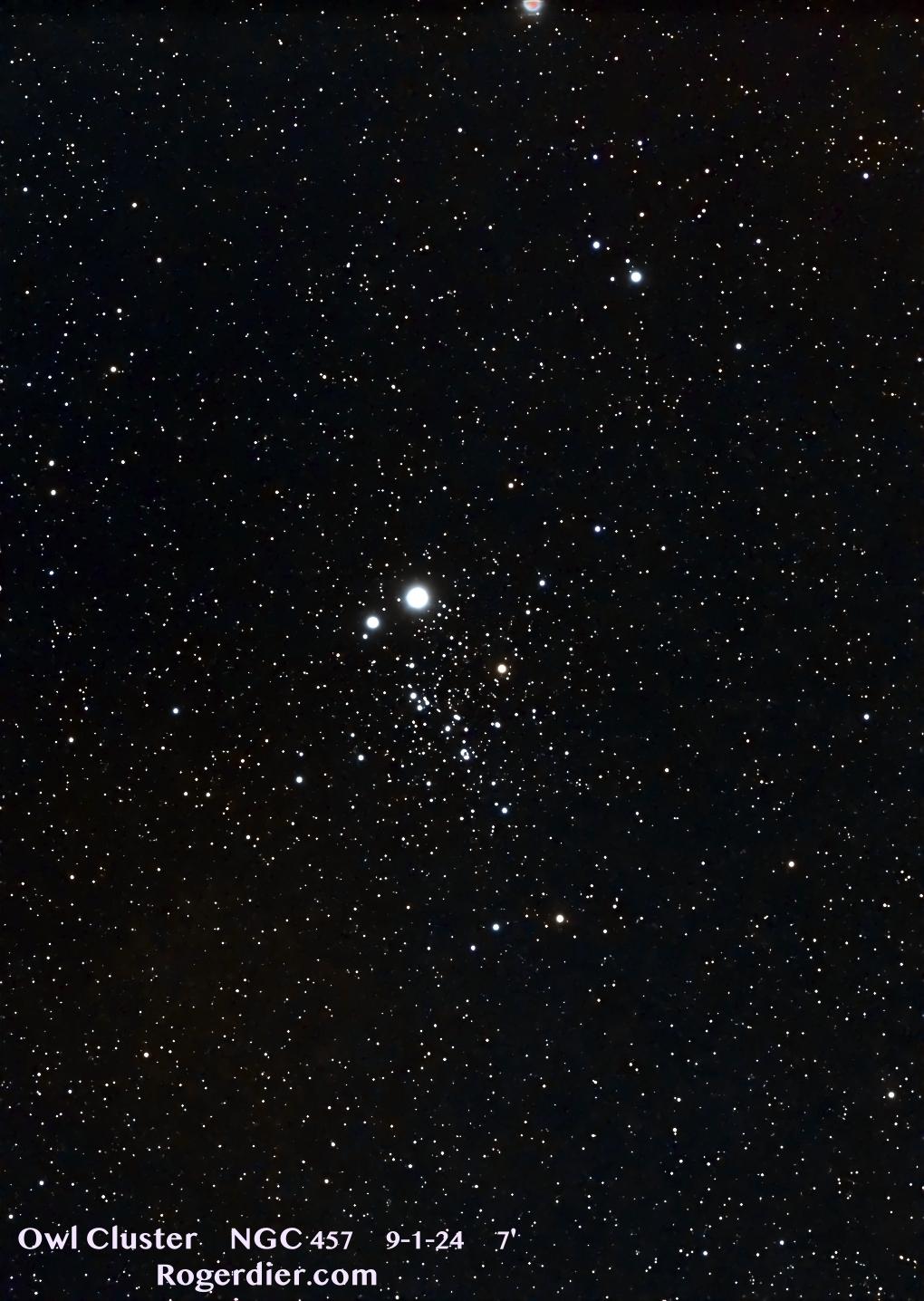 One of the more entertaining things your intrepid astronomer discovered during this past week under the Bortle 6 Oshkosh light dome is NGC 457, popularly known as the Owl Cluster. This open grouping of stars lies in Queen Cassiopeia’s boundary, and features two brighter stars, which can be construed as owl’s eyes. The brighter one is Phi Cassiopeia, shining at magnitude 5 and the other is HD 7902, dimmer by two magnitudes.