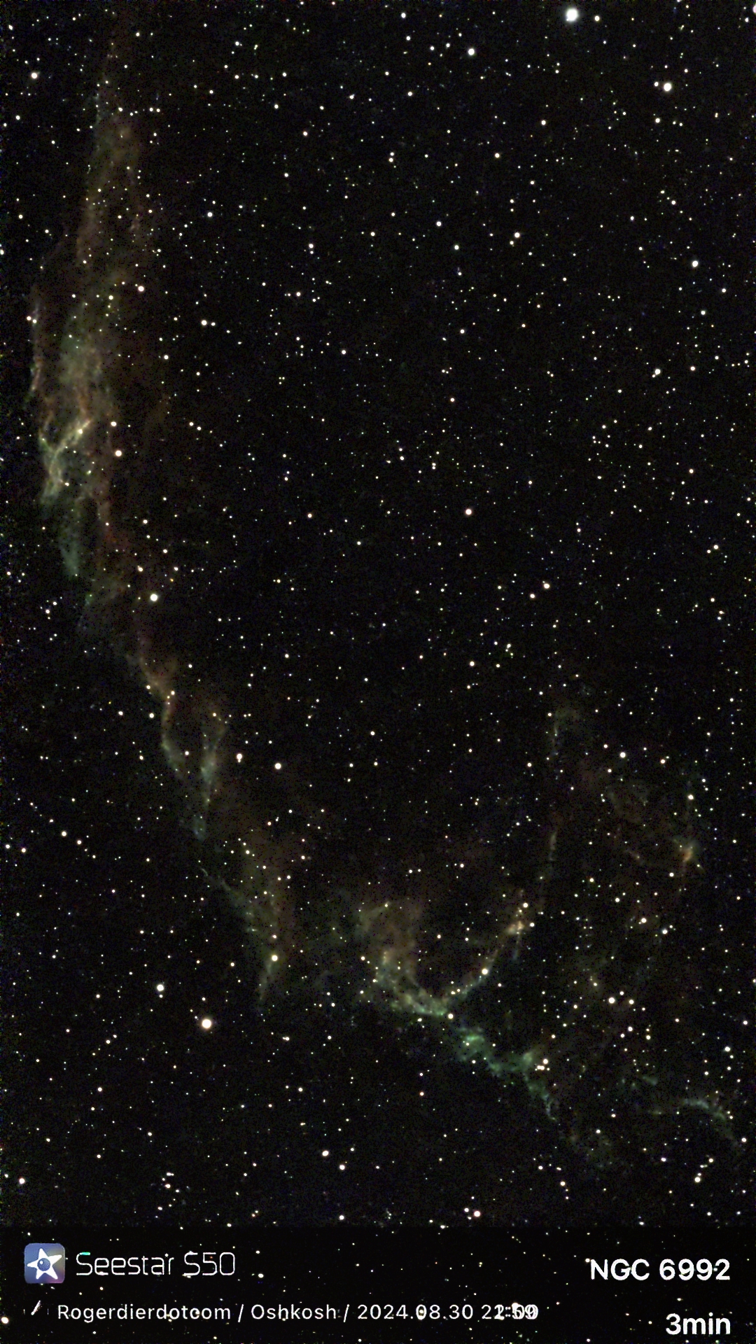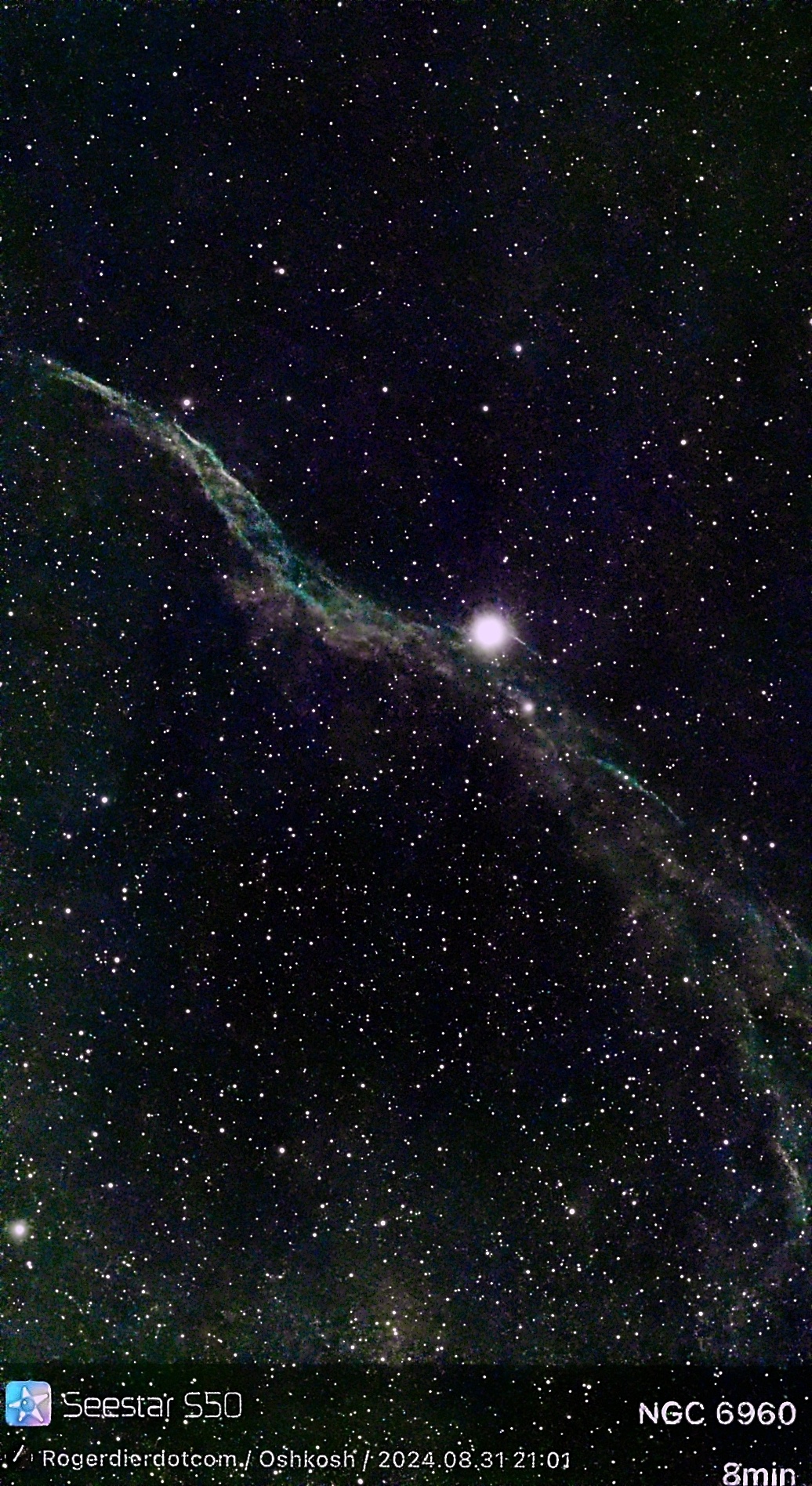 I turned the SeeStar S50 on the Veil a few times during the past 10 days. The Veil mainly consists of three sections, the eastern Veil, the western Veil, and the middle collection of fainter clouds known as Pickering’s Triangle.