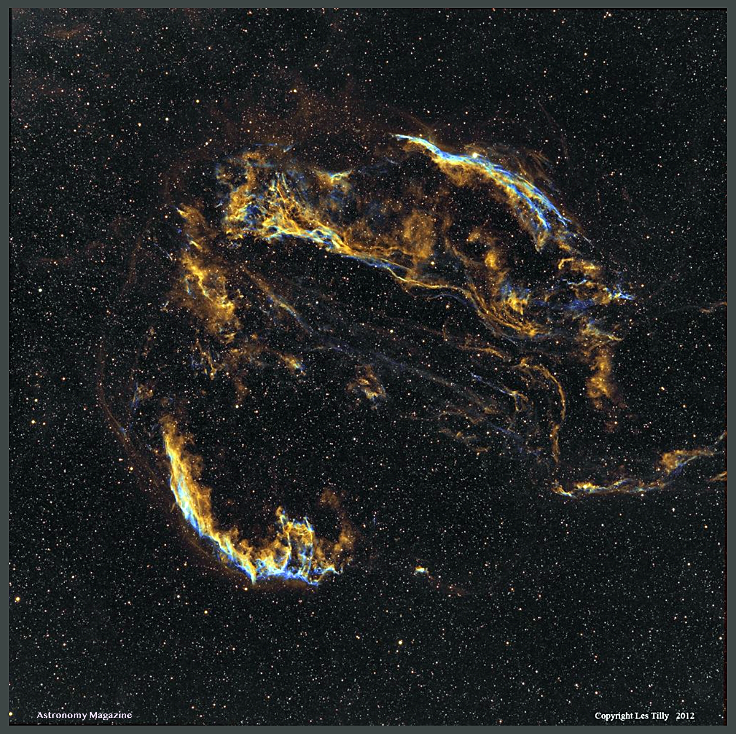 A dozen years ago, astrophotographer Les Tilly took a wide-angle shot of the Veil Nebula: east, west and middle Pickering. The Veil Nebula complex (NGC 6960/92/95) is 2,400 light years from Earth, and the energy of the explosion continues, with parts of the Veil receding from the long-gone Supernova at almost one million (938,000) miles-per-hour.
