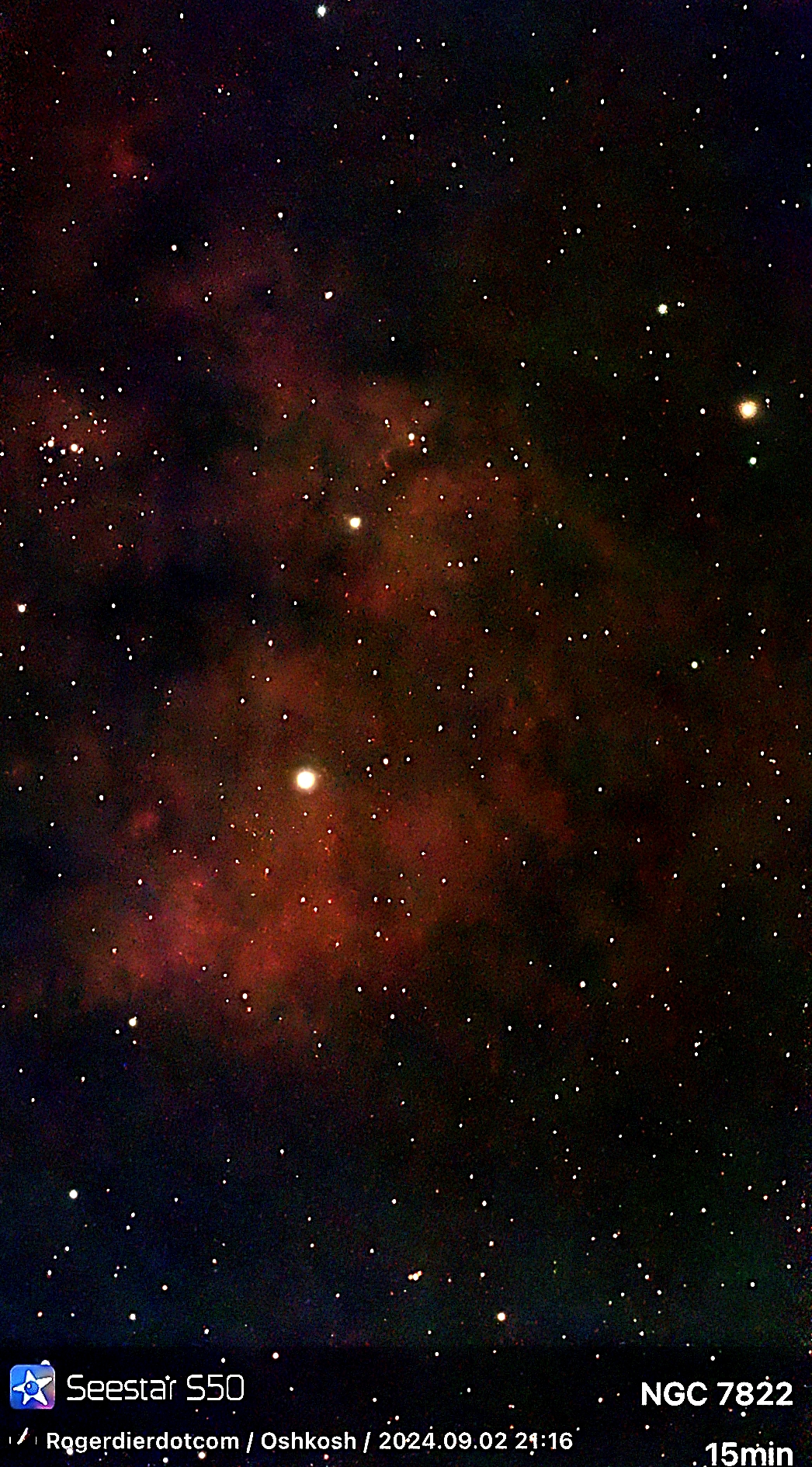 Nevertheless, I’m glad the SeeStar snagged a representative number of photons, which traveled 2,900 light years to the SeeStar’s 2.1-megapixel Sony IMX462 CMOS sensor. Star babies are emerging from this emission nebula, meaning super hot electromagnetic energy from newer stars creates the whole light show. The main source of energy is BD+66 1673, which is an eclipsing binary system with a luminosity about 100,000 times that of the Sun. Wrap your mind around that kind of bright, if you can.