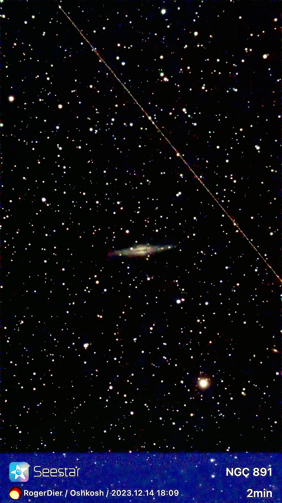 Another 2023 photo I recovered was taken in mid-December. The SeeStar was still new to me, and after first glancing at this photo, I thought, “Not bad for a beginner.” I didn’t have PixInsight back then (I had never heard of it), but I know it now. I processed 891 a few days ago. It’s like giving an old car hot wax. There’s a new sheen. The satellite slicing through the field during the two-minute exposure even looks like it knows where it’s going.