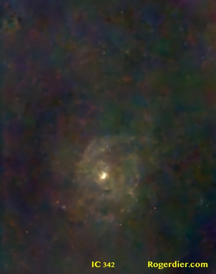 One of the more challenging objects I struggled to capture during the past ten nights is the barred-spiral galaxy IC 342, the so-called Hidden Galaxy in Camelopardalis. It’s not that it is overly faint at magnitude 9.1, it’s the fact that it lies only 10 degrees below the galactic equator. That means there’s a lot of interstellar goop to shoot through. The dust and debris between us and IC 342 is estimated to reduce its brightness by 2.4 magnitudes. It’s not close to us, either, with distance estimates between six and ten million light years.