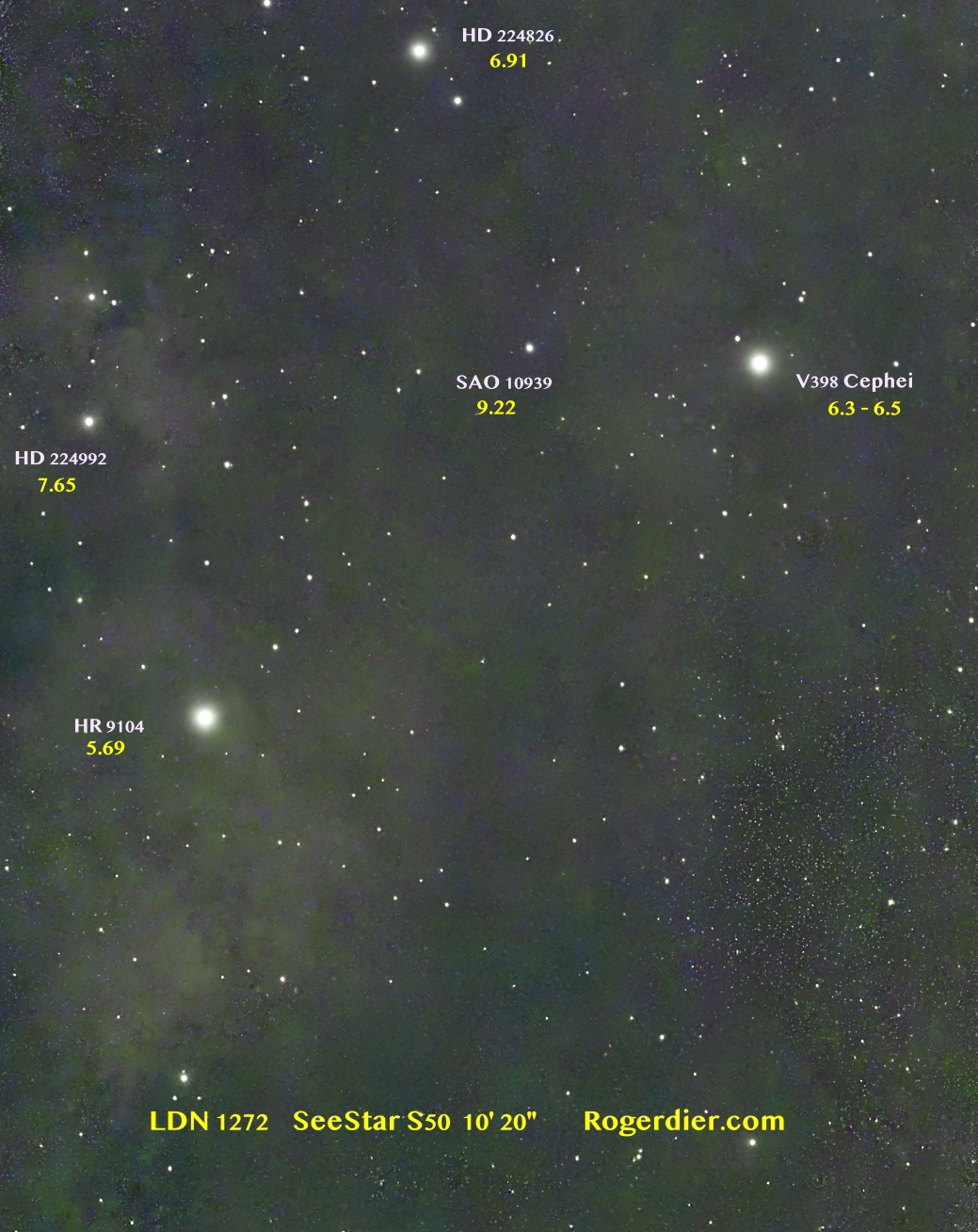 All the charming stars in the photo that I’ve identified by name and magnitude do not belong to the LDN 1272 nebula itself. They are all in the foreground. Still, it wouldn’t be as pretty a picture had they decided to live elsewhere.
