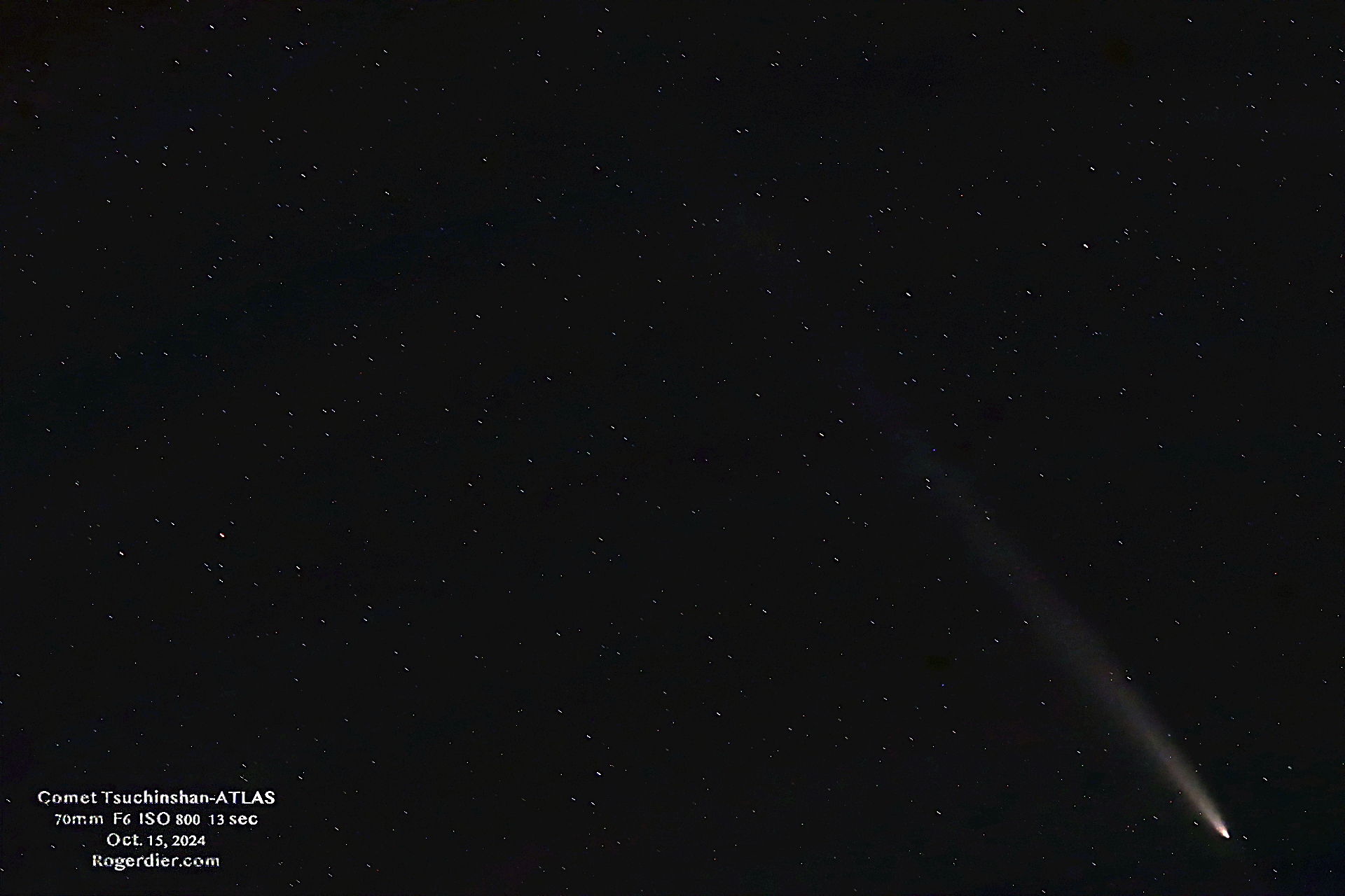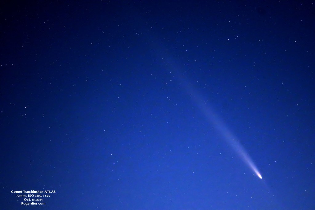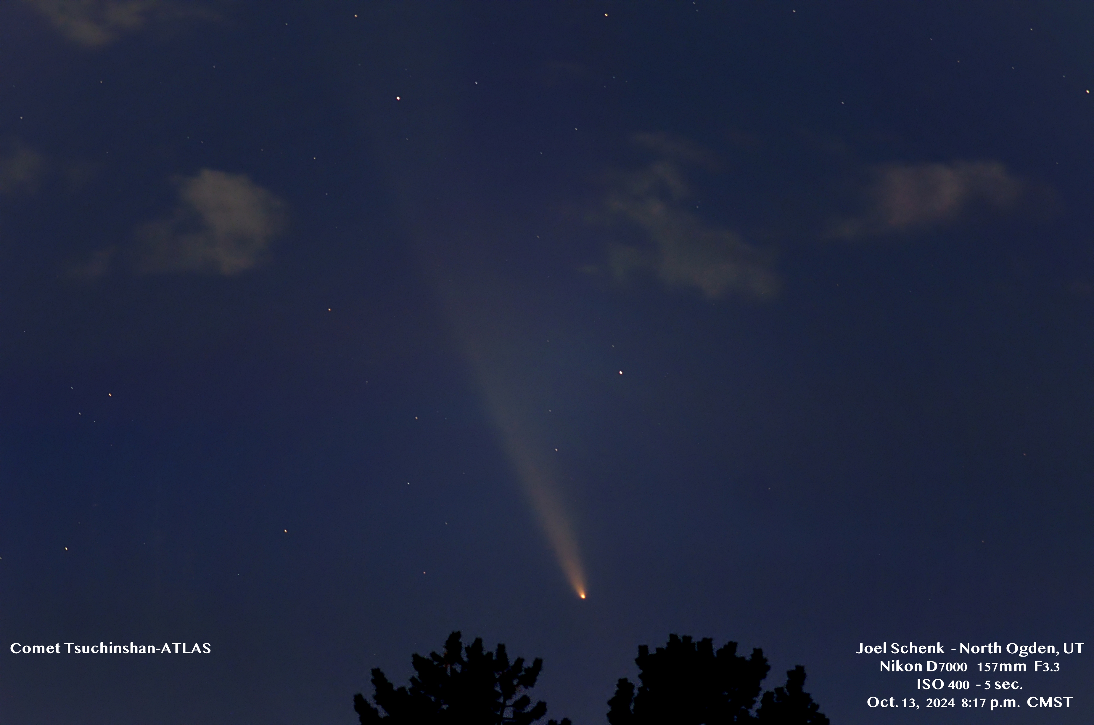 About a week ago, I alerted two friends in North Ogden, Utah that a new comet was coming out behind the curtain and into the night sky. One of them, Joel Schenk, climbed on his roof on Oct. 13 and took this picture of the comet. He excitedly texted me and Kevin Mikkelsen, a professional photographer, that he found Comet Tsuchinshan-ATLAS using binoculars. He ran into his home and went up a ladder, placed one of his smaller tripods atop a moisture removal apparatus on his roof and his Nikkon camera began clicking away. What is shown here is the result of Joel’s hustle. It’s a beautifully framed shot, framing which Joel said was “purely accidental.” Well done, either way.