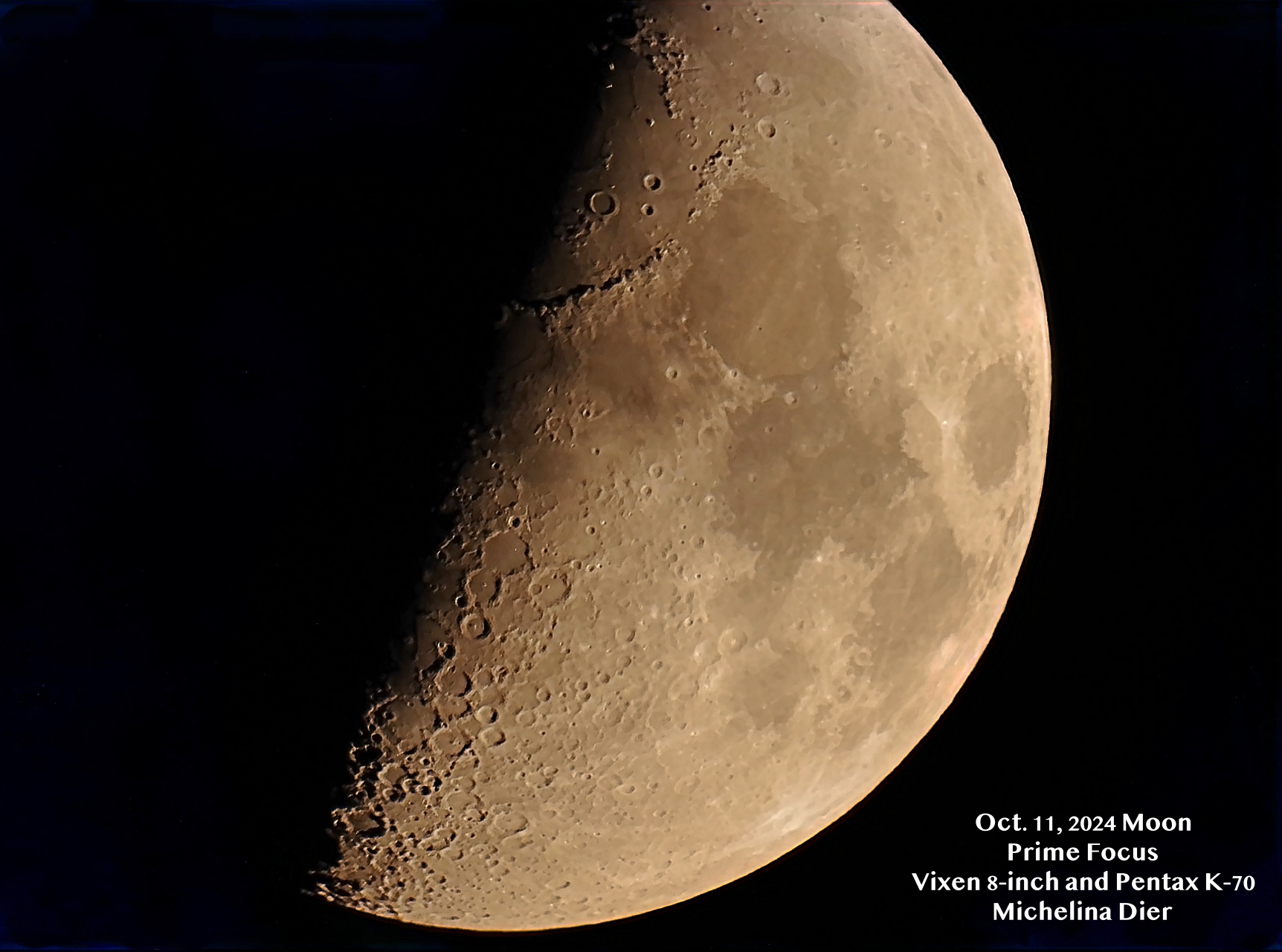 On a different evening when the comet was too close to the sun for observation, Michelina and I took some pictures of the moon with a Pentax K-70 camera and a Vixen 8-inch as the lens. Michelina looks great in front of the lens, and does great behind it.
