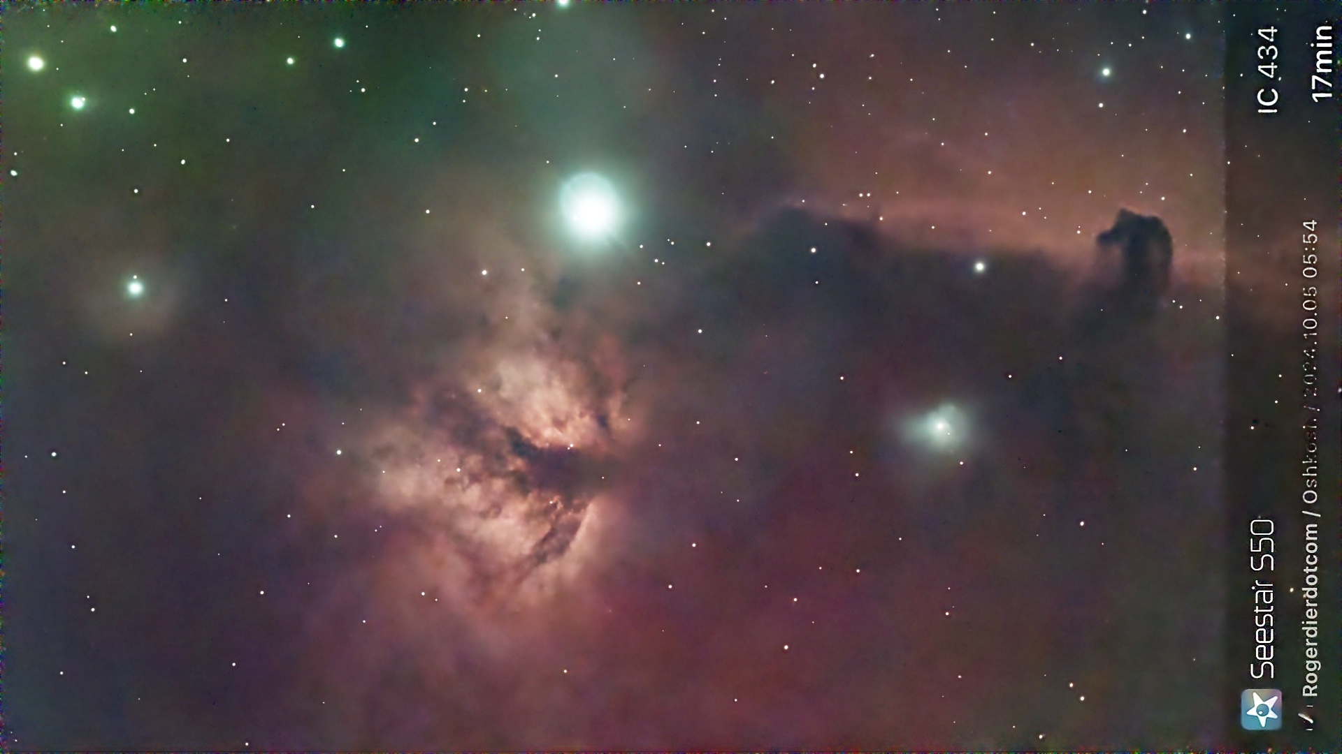 Between the morning hunt for the comet and what I snagged last night, I took this picture of the Horsehead Nebula one morning about 5:30 a.m. The Horsehead Nebula is one of the first objects shown in the kid astronomy books, which I devoured back in the day. The Horsehead Nebula is all dust in silhouette. In this photo, which I flipped horizontal to accentuate the equine feature, we can see the Horsehead Nebula cast a shadow on a dust cloud in the foreground.