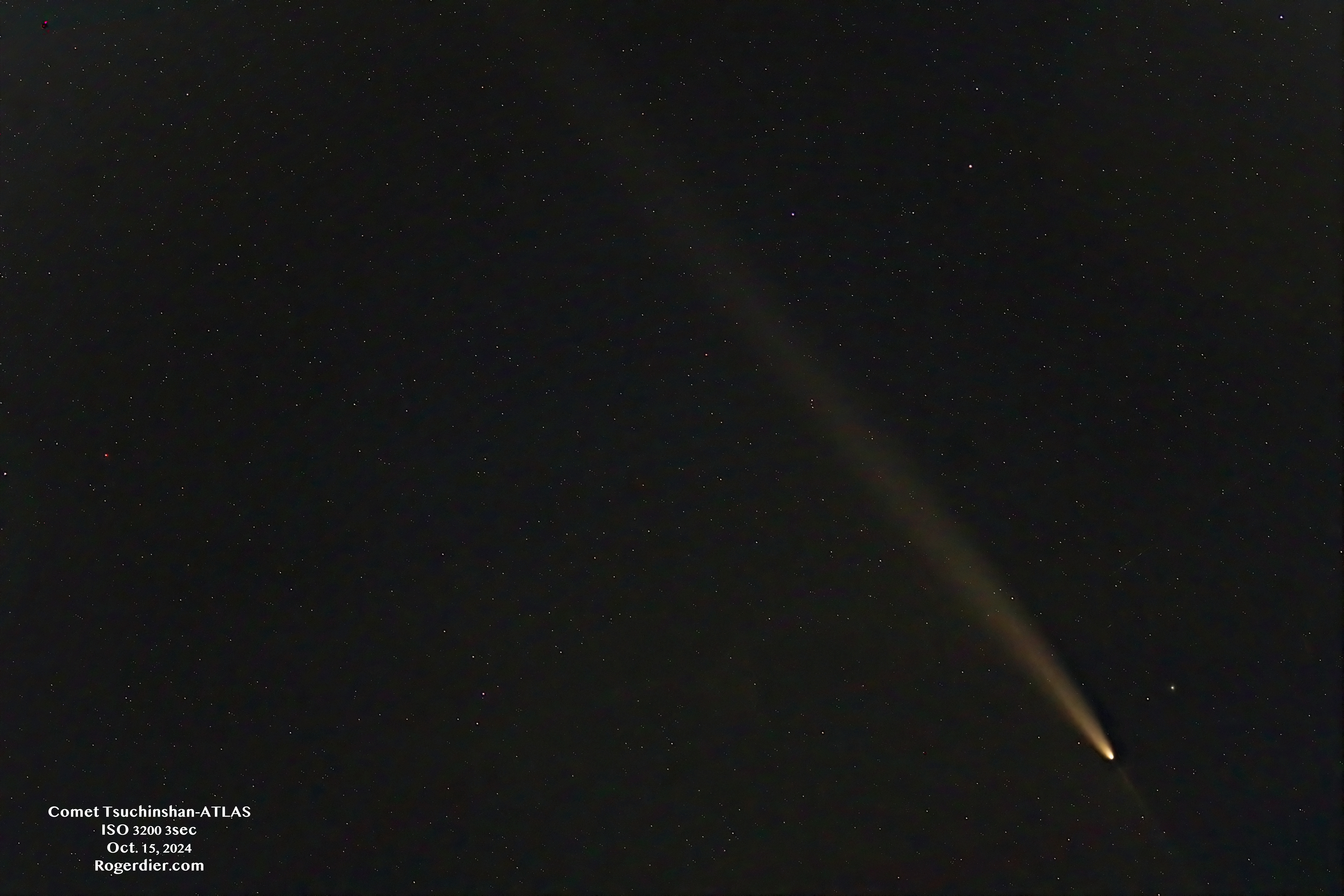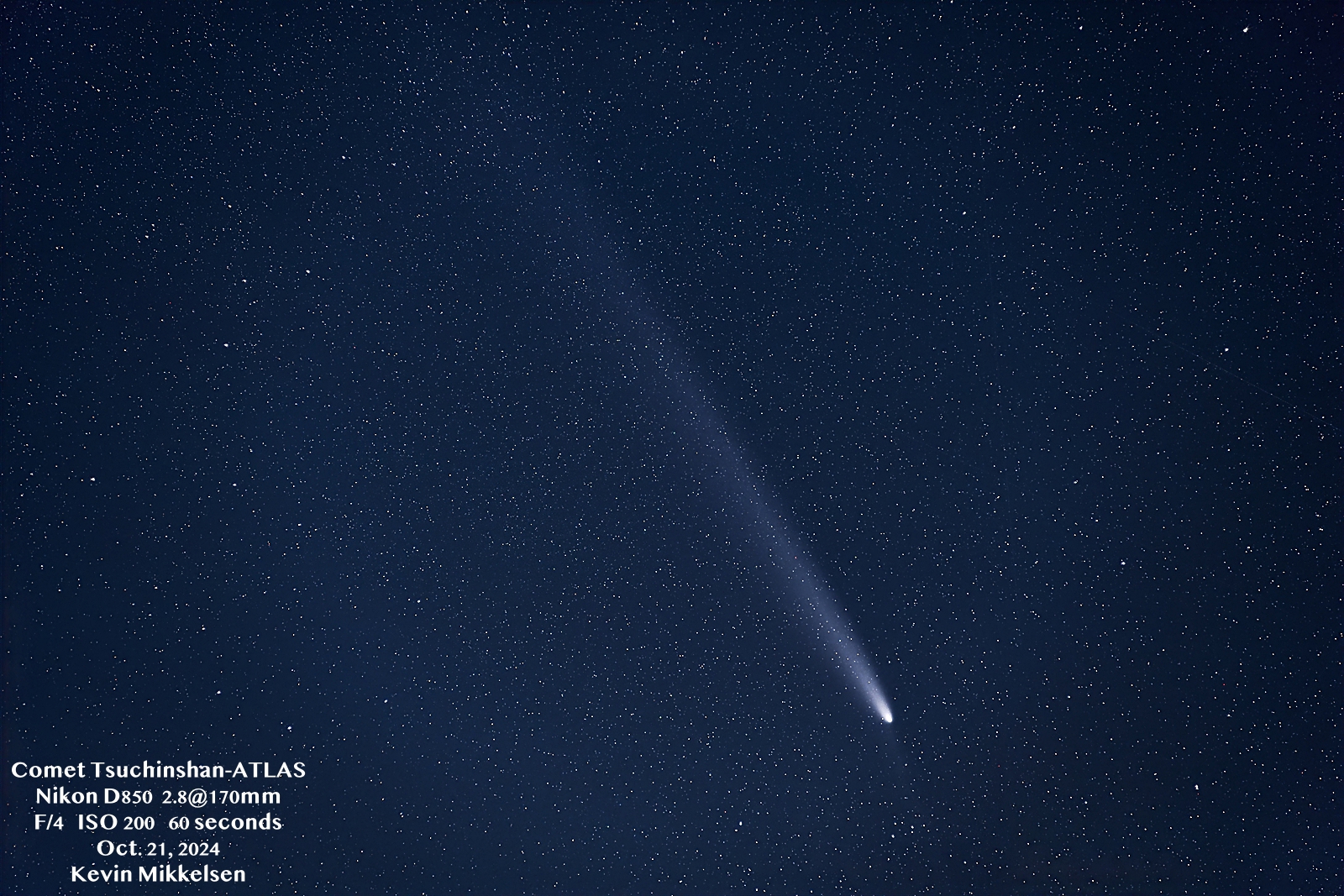 Kevin Mikkelsen is a professional photographer who first began photographing comets in July 2020 when the long-period Comet NEOWISE sparkled in those summer nights. Using a iOptron SkyGuider Pro mount, Kevin shot this beautiful 60-second exposure of Comet Tsuchinshan-ATLAS. Like a proud peacock, the comet continues to unfurl its beautifully shaped tail as it says so long to the sun and members of the inner solar system.