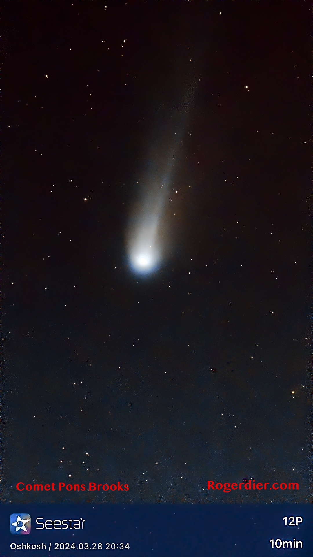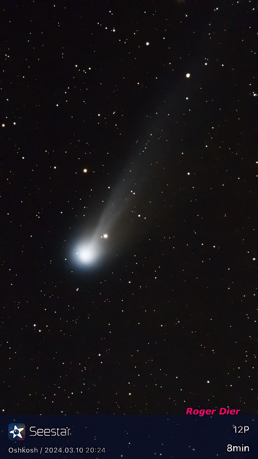 All the pictures here were taken by friends of your intrepid astronomer, or that guy himself. The first image, on the left of your screen with the coma beautifully framed between the top of two Utah trees, came my way on Oct. 13, just a few nights after the alleged -4.9 magnitude burst. Comet Tsuchinshan-ATLAS wasn’t close to being that bright. Joel Schenk, the photographer, first spotted it with binoculars after sunset over North Ogden, Utah. Two nights later, your intrepid astronomer captured it west of Oshkosh, well outside the town’s Bortle 6 light dome; without optics, he could not spot it even though it was purported to be between second and third magnitude.