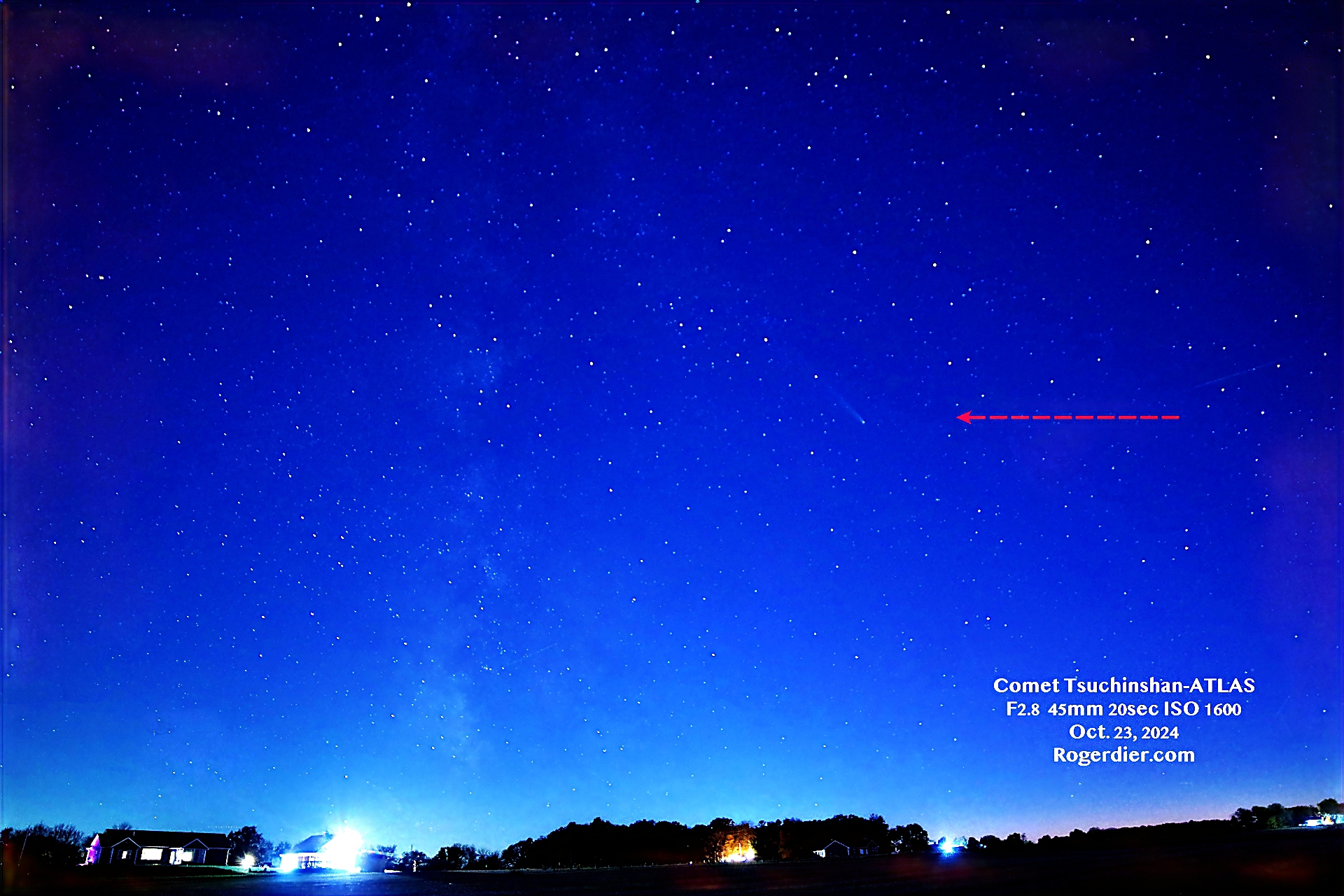 Comet Tsuchinshan-ATLAS is fading away like the last ember of a campfire. On Wednesday evening, Oct. 23, 2024, I took my Pentax to the usual spot on Evans Road five miles west of Oshkosh. That night, it was magnitude 5.1. The wide-angle photo shows the comet’s position in relation to the sinking summer Milky Way; barely perceptible in the deepening twilight.