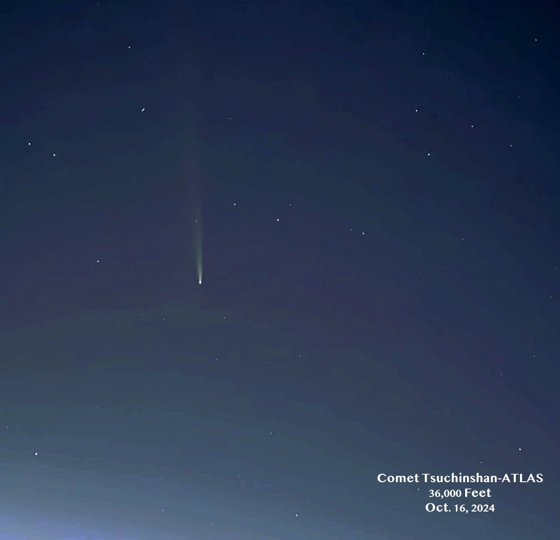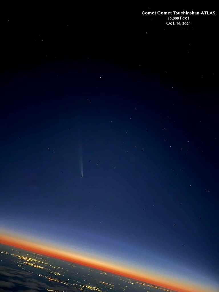 An airline pilot friend could barely see Comet Tsuchinshan-ATLAS out of his cockpit window Tuesday night (Oct. 22) from 36,000 feet—and above 75% of Earth’s light-sucking atmosphere—when the comet was listed at 4.6 magnitude. Still, his splendid photos, three-second iPhone images taken eight sunsets ago on Oct. 16 from the same altitude, show how Comet Tsuchinshan-ATLAS appears above Earth’s atmosphere. The comet’s tail sets sail in all of these photos. Better observers than I report when Comet Tsuchinshan-ATLAS whipped around the sun, it sported a tail 20-degrees long. That I believe.
