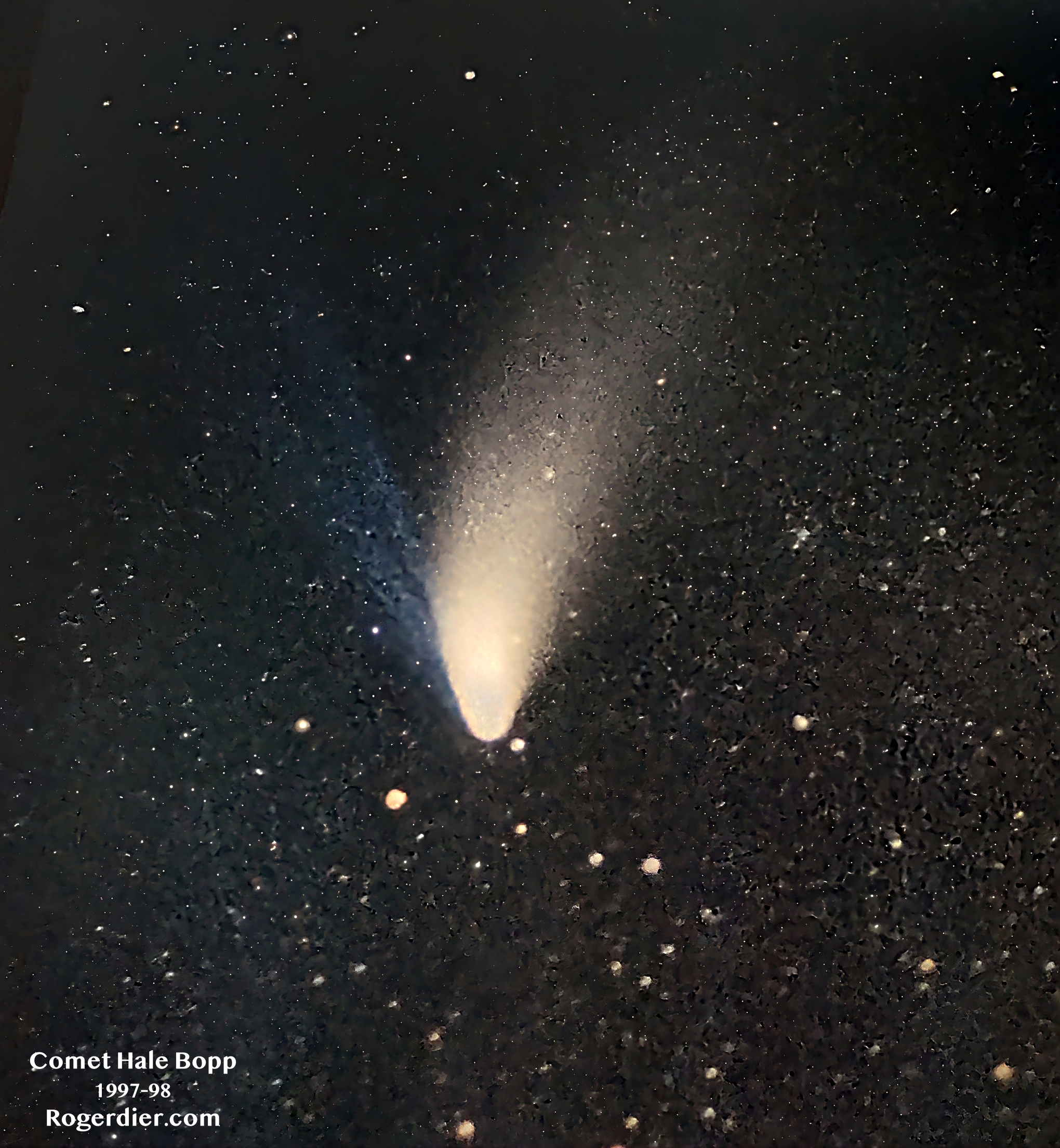 Long-period comets—orbits longer than 200 years—usually come from the Oort Cloud; more rocky ice rubble left over from the formation of the solar system. The Oort Cloud begins about a third of a light year from the sun and extends out for a full light year, give or take. The famous Comet Hale Bopp, which was a naked-eye comet for an astounding 18 months between 1997-98, was an especially thick Oort Cloud chunk, 41.2-miles wide. It hung like a lantern over the horizon for months, showing off both a dust tail and an ion tail. That was the genuine Comet of the 20th Century. The picture here was made on film, then digitized. Astronomers say its most recent trip toward the sun shortened Hale Bopp’s orbital period to 2,399 years. Look for it again in the year 4,385.