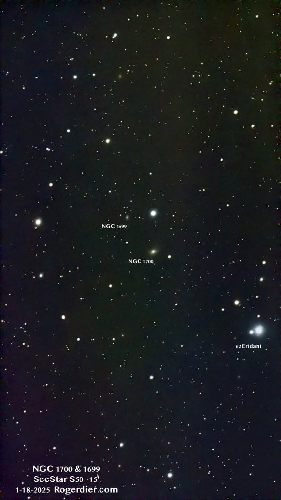 Off the beaten trail of the tourist site M42 is the constellation of Eridanus the River. The galaxy NGC 1700 piqued my curiosity on the windy night of Jan. 18, 2025. It’s way out there,180 million light years from our own galaxy. I took a 15-minute exposure with my little SeeStar S50, and NGC 1700 comes off as a boxy diffused smudge. The current thinking is that three billion years ago, NGC 1700 was actually two galaxies that merged, and the merger is ongoing. Classified as elliptical, the Chandra instrument in 2002 took an X-ray of the area and discovered NGC 1700 sits at the center of a rotating caldron of hot gas. At magnitude 11.2, you’d need a six-inch glass to find it visually. That and a dark sky.