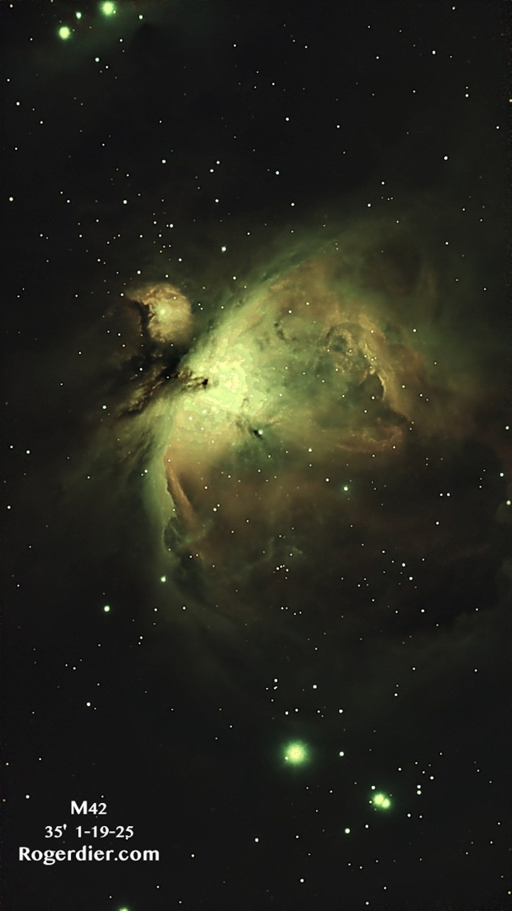 Your intrepid astronomer visits more than a few astronomy sites during his infrequent online trekking. This time of year, nearly everyone who photographs the night sky has proof that they have visited popular winter sky tourists stops. Many of the modern amateur portraits are stunning. Equivalent to the American Grand Canyon, Yellowstone National Park or a Disney Theme park (pick one) is the great Orion Nebula M42. The smudge is visible to the naked eye even in moderately bright skies. Point a SeeStar at the stellar nursery like M42, pile up 10-second long exposures (the featured portrait has 35-minutes worth of stacked images), add a little Pixinsight processing, RC-Astro XTerminator software, which wipes out atmospheric noise and reduces star size, and garnish with a SetiAstro function to reduce star halos and behold: A miracle 1,350 light years away appears.