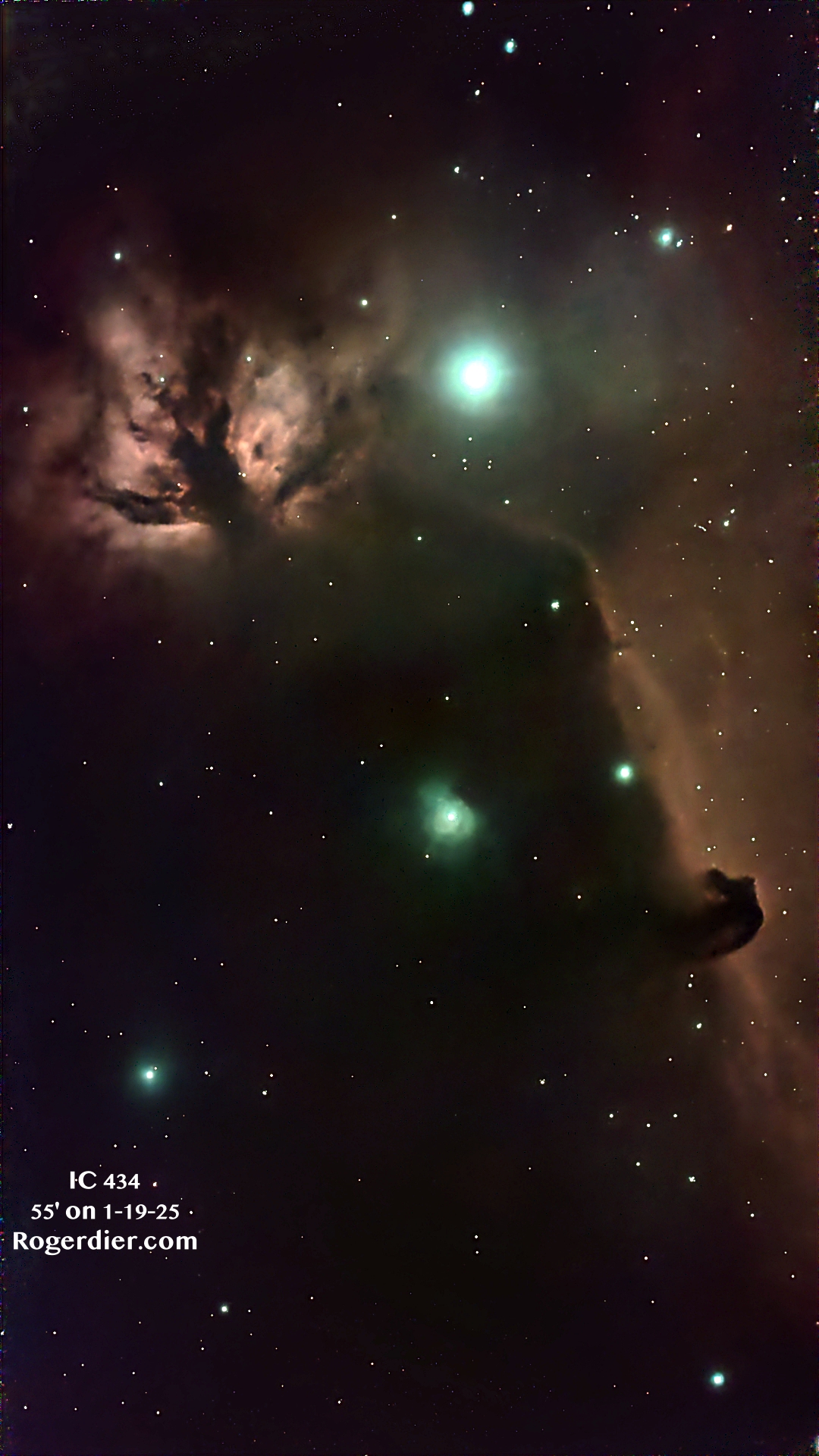 The Flame and Horsehead nebulae are must-see tourist stops in Orion. The familiar Horsehead silhouette is often seen in elementary school books on astronomy. The image pictured here is one of my longer SeeStar exposures; there are 3,300 seconds of photos piled up. Do the math and it comes to 55 minutes of light falling on the SeeStar S50’s Sony sensors.