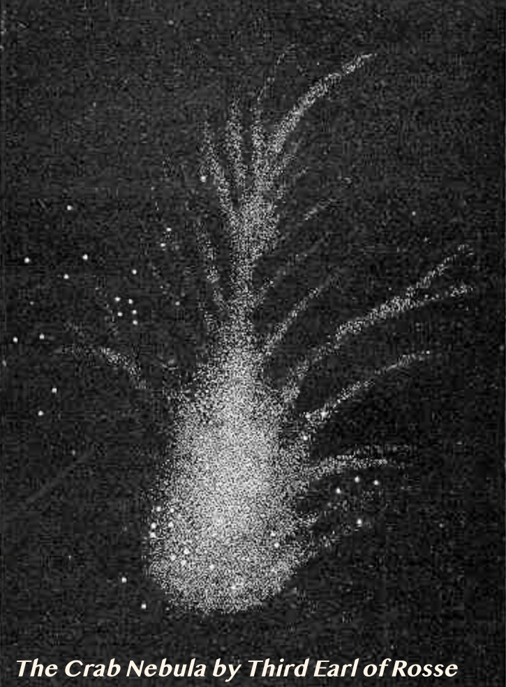 Early telescopic astronomers like Englishman John Bevis first laid eyes on what was left of the supernova in 1731. William Parsons, The Third Earl of Rosse, sketched it in 1844. Using his 36-inch speculum-mirror telescope at Birr Castle, County Offaly, Ireland, The Third Earl’s initial sketch of M1 looked like a crab. Later in his life, after The Third Earl built a telescope twice that size—also located at Birr Castle—the nebula looked nothing like a crab. But the original nickname stuck.