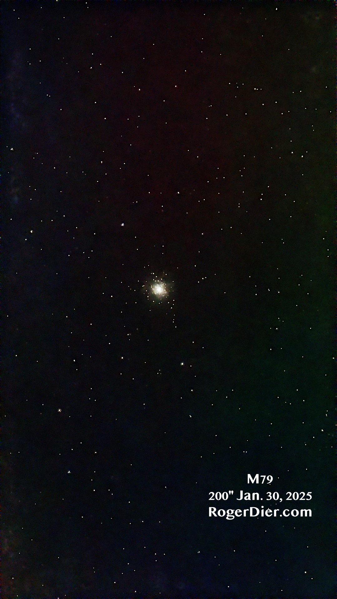 Late in January I photographed M79, an object I had never viewed before. It’s 40,000 light years from Earth and 18 light years wide. M79 resides in the constellation Lepus the Rabbit. Lepus is south of Orion and even south of Canis Major. When I photographed it, it was barely 10-degrees over the southern horizon from 44-degrees north latitude. A pretty globular cluster in an odd place in the exurbs of our galaxy. Most globulars settled around the center hub of the Milky Way, but not snooty M79.