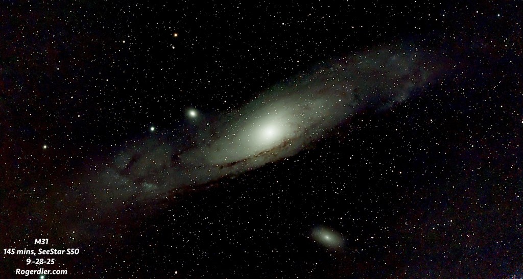 I was happy this past week to take to SeeStar S50 out to our driveway on the north side of the house and shoot the showpiece of the autumn sky, M31, also known by several other names, the most popular is the great Andromeda galaxy. M31 is the brightest of three galaxies within a small field of view, and at 2.5 million light years distant, it’s the farthest object the human eye can see without optical aid. If you live under extraordinarily dark skies, or travel to a black dome void of bright moonlight and artificial light, you can see M31 in the constellation of Andromeda. It shines at 3.4 magnitude. This time of year is when M31 absolutely ripens for observers and astrophotographers. M31 is delicious and it appears in the NE sky at sunset about 35 degrees above the horizon.